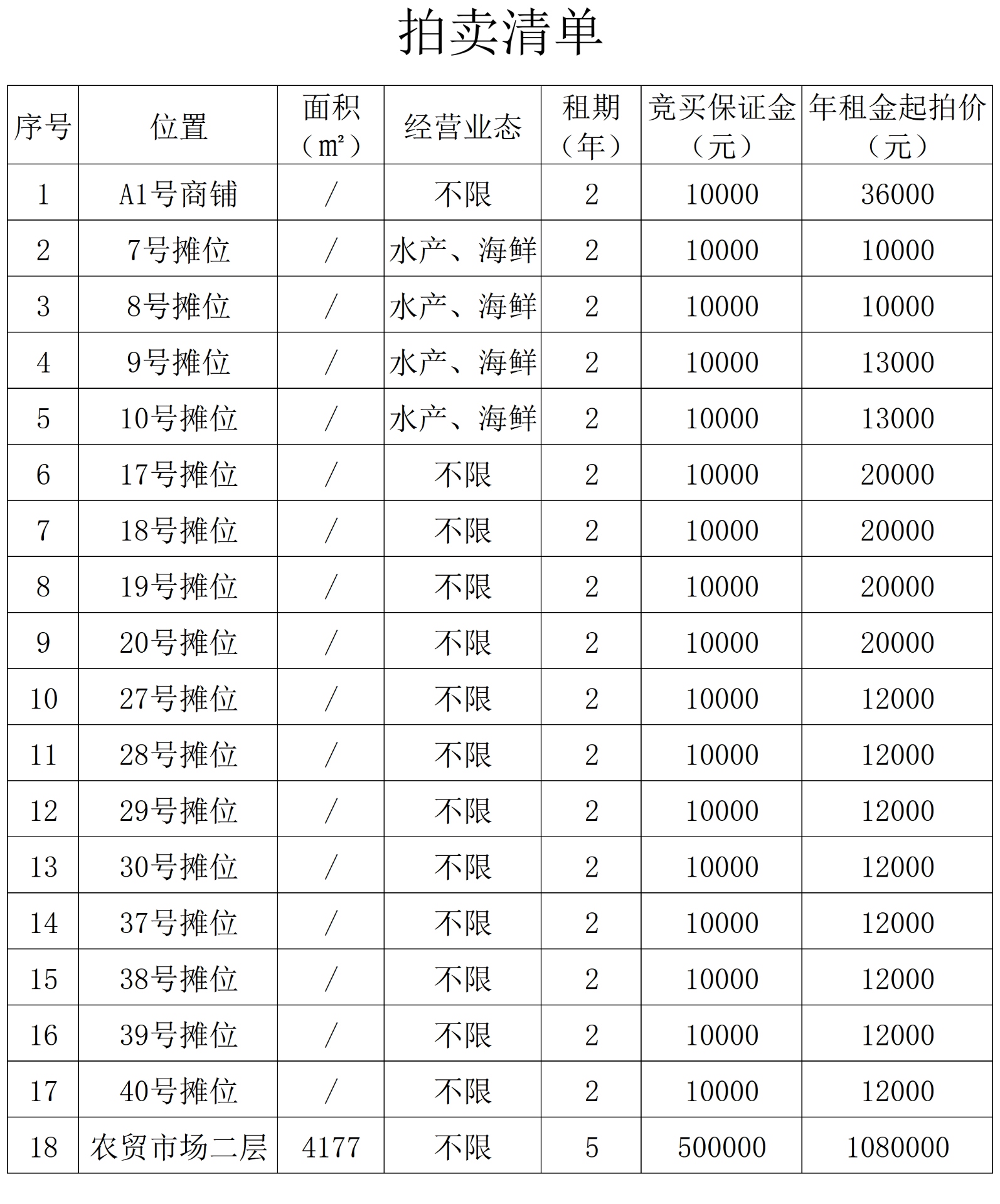 浙江省湖州市吴兴区中兴大道5号三合家园农贸市场二层及一层部分摊位租赁使用权,具体坐落位置、面积、租期、经营业态、竞买保证金金额及年租金起拍价详见《拍卖清单》。以上标的,均有保留价。